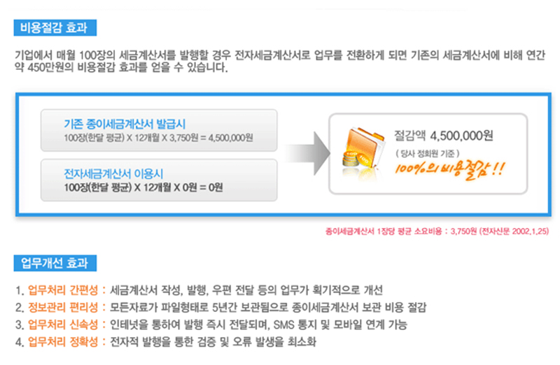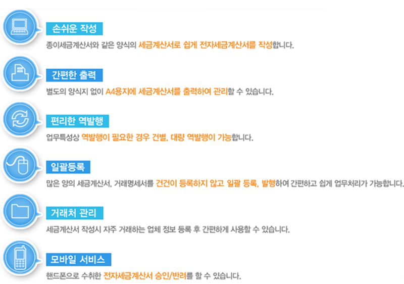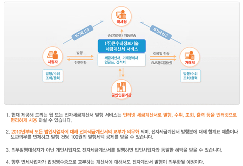 전자세금계산서는 기존의 종이 계산서에 수기 작업으로 발행하여 인편 또는 우편을 통하여 전달하던 세금계산서가 아닌, 신뢰할 수 있는 인증서를 사용하여 전자적으로 발행한 세금계산서로써 인터넷을 통해 발행·수취·세무신고 및 회계처리까지 신속하고 안전하게 처리할 수 있는 세금계산서입니다.